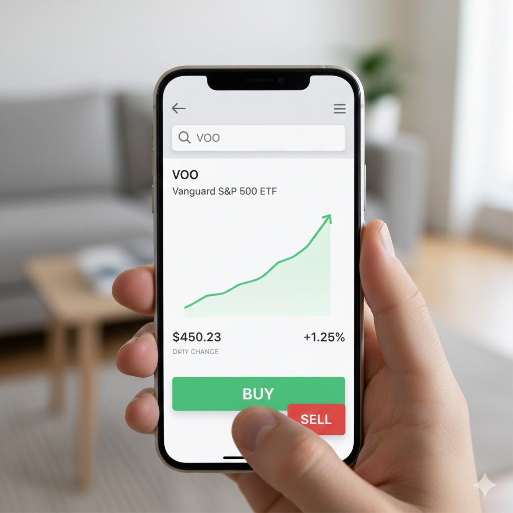[이미지 #4: 스마트폰 증권사 앱에서 VOO를 검색하고 매수하는 화면]